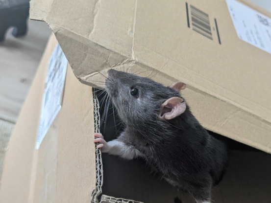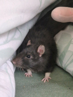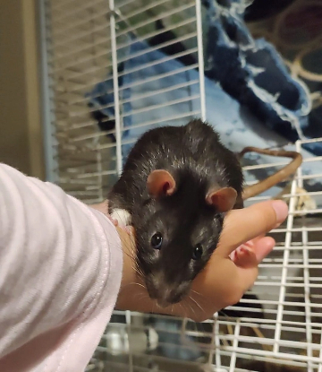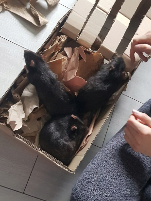 Avec ses frères Raven et Drago, ils viennent d’un sauvetage de plus de 150 rats qui vivaient dans des conditions insalubres chez des particuliers qui avaient laissé leur couple de rats se reproduire librement et était totalement dépassé par la situation.