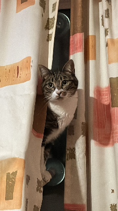 Elle est hyper curieuse donc elle se cache pour observer les invités. Elle adore grimper sur son arbre à chat et avoir un dodo en hauteur pour surveiller la pièce.
