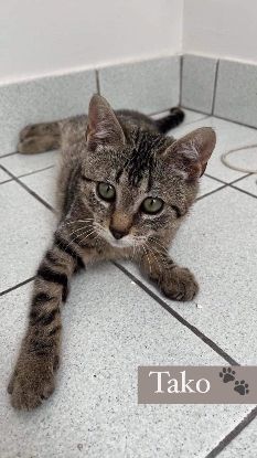 Tako est un chaton d’environ 3 mois, très câlin mais qui n’aime pas trop être porté.