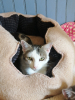 C'est une minette sur la défensive au début mais qui se montre vite très demandeuse de caresses , elle s'est révélée une très bonne maman de substitution pour les chatons en famille d'accueil qu'elle lave et éduque et avec qui elle joue beaucoup .