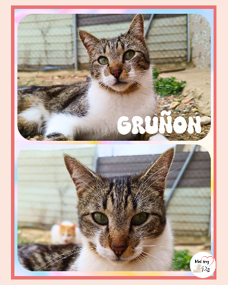 GRUÑON est un adorable chat, assez indépendant, qui devient très affectueux une fois en confiance avec les humains qui l'entourent.