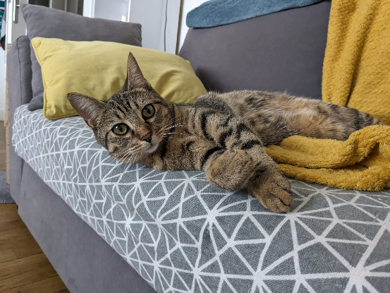 Une fois la mise en confiance installée, elle se révèle être une petite chatte absolument adorable qui viendra chercher les caresses et se poser à vos côtés sur le canapé.