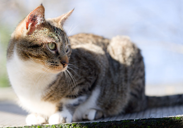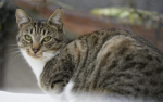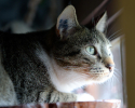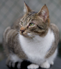 Akio, jeune chat adulte au pelage tigré et blanc orné de petites chaussettes blanches, vivait paisiblement sur un site de nourrissage à Rungis.