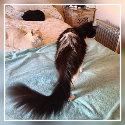 Il adore être dans les bras, les caresses. Il s'entend très bien avec les autres chats.