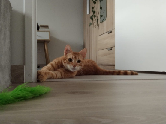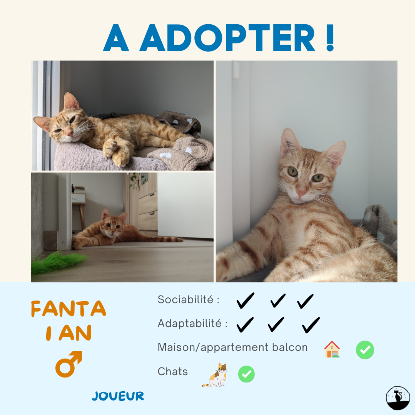 Fanta est un chat d’abord très mignon. Ce petit choux croque la vie à pleine dent. C’est un grand joueur, il adore jouer tout seul avec des petites balles, ou bien jouer avec ses compagnons chats. Il sera aussi très content de jouer avec vous au plumeau ou au laser ! Si vous offrez à Fanta un panier à jeux, il sera le plus heureux des chats. En journée, Fanta est un chat qui chasse les mouches, réclame des câlins et roucoule quand on lui parle. Bref, un jeune chat très craquant !