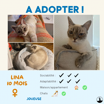 Lina est une très belle demoiselle âgée d’environ 10 mois. Avec ses beaux yeux bleus Lina saura vous séduire ! Elle est avant tout très joueuse, mais aussi curieuse et vive. Cette minette vous assure de passer de bons moments et beaucoup de rigolade en sa compagnie. Lina est aussi affectueuse, elle adore faire sa sieste sur les jambes de ses humains.