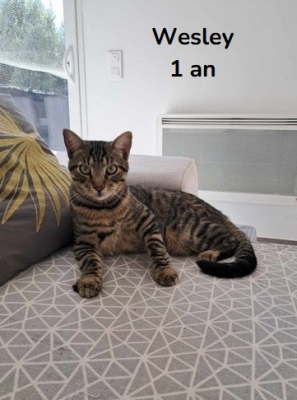 Wesley vient de fêter son 1er anniversaire, c'est un jeune chat assez réservé au départ, mais une fois en confiance, il devient pot de colle ! Il est curieux, joueur et trèèèès gourmand (la pâtée est sa passion dans la vie). Il aime être câliné, on peut lui faire des bisous, le porter (un peu). Très sage, il ne fait pas de bêtises. Il roucoule de façon adorable.