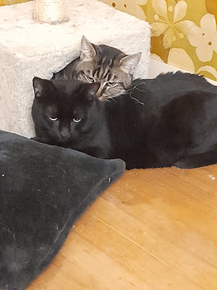 Ils sont très proches mais sont néanmoins très amis avec les autres chats, ils aiment jouer ensemble, dormir ensemble, manger ensemble, peut-être un peu trop ! un peu d’exercice ne leur fera pas de mal ! Ils sont aussi très bavards, ils ont pleins de choses à raconter !