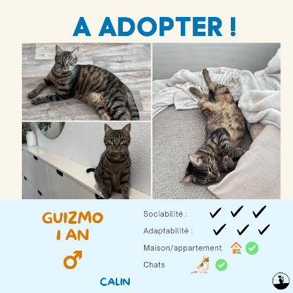 Guizmo s’entend très bien avec ses congénères chats. Mais au vu de la mauvaise expérience dans sa première famille adoptive, nous souhaiterions qu’il soit le seul chat dans sa nouvelle famille. Il pourra profiter pleinement de tous les câlins et l’amour de ses humains.