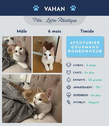 Bonjour ! Moi c'est Vahan, j'ai 6 mois, je suis un grand chat plein de vie ! Je suis actuellement en famille avec d'autres chats et je les adore ! Par contre je ne connais pas les chiens. J'aime beaucoup jouer avec les cannes à pêche et je suis un gros gourmand.