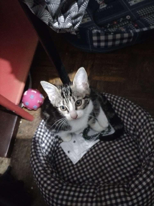 Comportement : FRIMOUSSE fait partie d'une fratrie de 5 chatons que nous avons pris en charges depuis sa naissance car sa maman scoubidou est une chatte libre qui vie dans le 19 ème qui a fait ses petits chez une dame en rdc. Elle est sociable et propre.