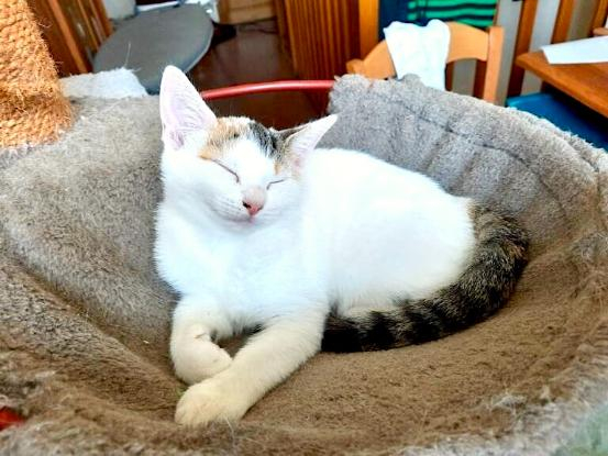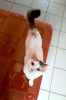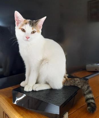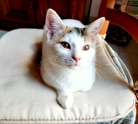 Blanche, femelle née en juin 2024. Joueuse, curieuse, dynamique, aventurière et câline. Elle a le contact facile, sociable. Habituée chats/chien.