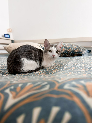 C'est une jeune chatte qui a besoin d'un peu de temps pour se détendre et prendre confiance mais une fois à l'aise c'est une petite boule d'amour.