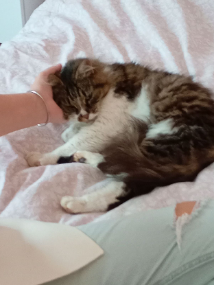Anwar, une chatte de race Angora turc, tricolore, est à la recherche d'un foyer aimant.