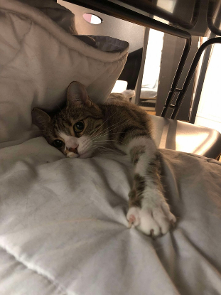 Aujourd’hui, je prends mon temps pour explorer et apprendre à me sentir bien. J’aime particulièrement regarder par la fenêtre, observer ce qui se passe dehors. Je suis aussi une petite grimpeuse : escalader et découvrir de nouveaux recoins, c’est mon passe-temps préféré !