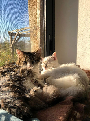 Surtout qu’en dehors de ça ce sont deux chats pleins d'énergie toujours prêts à s’amuser et se faire câliner ! Et lorsque qu’ils ne joueront pas ensemble, vous aurez le bonheur de les voir dormir l’un contre l’autre et venir quémander quelques papouilles. Car même si Amboka reste plus timide, il est tombé amoureux des caresses et sait en demander !