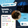 Spinelle est une très très très gentille mamie chatte. Agée d’environ 10 ans, Spinelle est une minette extrêmement douce et tendre. De nature discrète et sage, elle adore profiter des coins de soleil pour faire la sieste. Elle aime le confort, mais aussi les friandises. Sage comme une image, elle ne demande qu’à trouver sa place au sein d’une famille qui pourra enfin lui offrir une vie agréable et confortable.