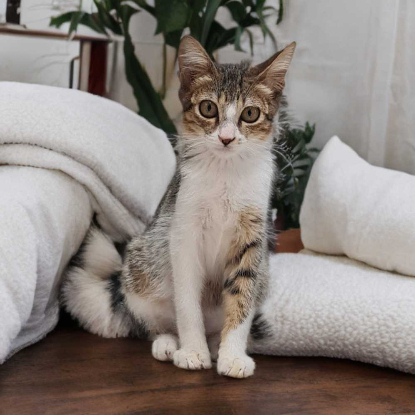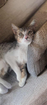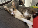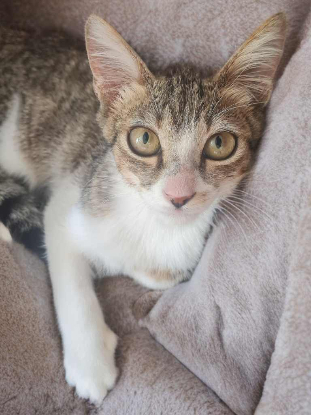 TSUNA est un joli chaton blanc et tigré, dont la date de naissance a été estimée au 15/12/24.