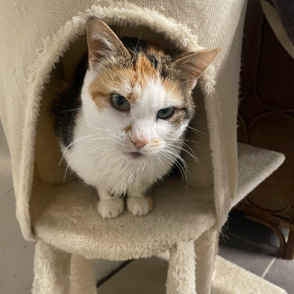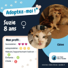 Suzie est une très belle choupette tricolore, âgée d’environ 8 ans. Une minette bien dans ses patounes qui aiment énormément la présence humaine. C’est un petit pot de colle qui apporte de la joie et beaucoup d’amour au quotidien. Suzie adore dormir avec son humain, le regarder cuisiner, l’accompagner lors du télétravail. Suzie est douce, plutôt calme. Son activité préférée : les bains de soleil, et se faire la toilette. Suzie a vraiment tout pour plaire !