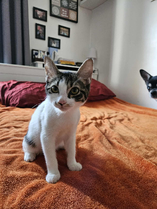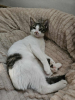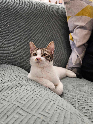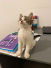 UZZY est un joli chaton blanc et tigré, dont la date de naissance a été estimée au 17/02/25.