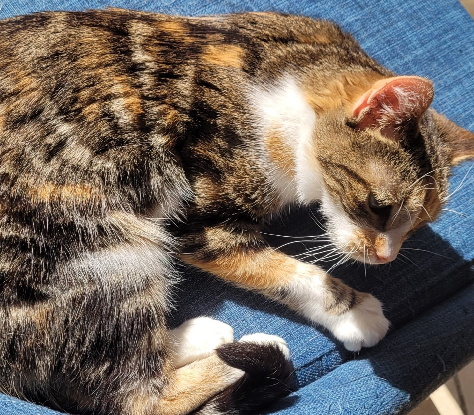 Après de nombreux soins, il a été décidé de mettre fin à sa quarantaine. Saya a alors pu partir à la rencontre des autres chats et du chien de la maison et tout s'est très bien passé. Aucune agressivité, pas forcément de recherche de contacts avec eux non plus. Mais pour Saya, ces moments dans la pièce de vie avec les humains et les autres animaux ont sublimé son regard, ont mis de la lumière et du bonheur dans sa vie. Elle se pose sur une chaise, sur le canapé ou dans l'arbre à chats et observe et s'endort. Elle adore les siestes au soleil et regarder la vie dans le jardin. Et puis, un jour, Saya a découvert le coffre à jouets des chats et encore une fois le bonheur pour elle. Elle court après les souris, les balles, joue avec les pompons. Elle joue tel un chaton.