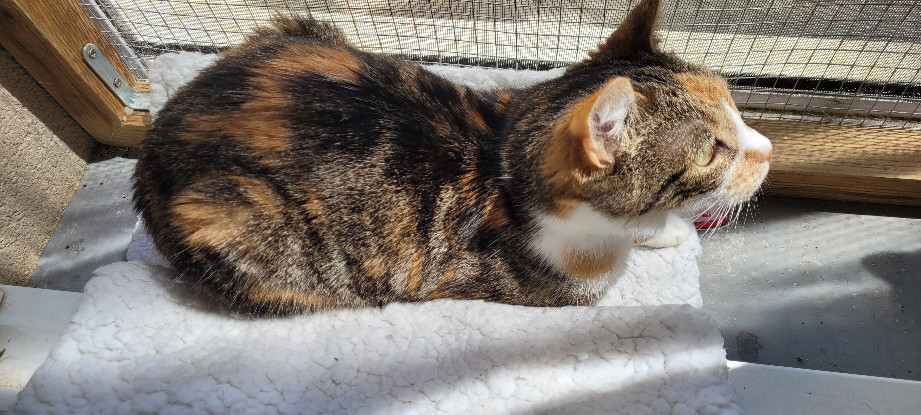 Saya a été installée dans une pièce de quarantaine dès son arrivée. C'était une chatte craintive et dans la souffrance : elle a dû connaître un passé douloureux voire de maltraitance compte tenu de son attitude.