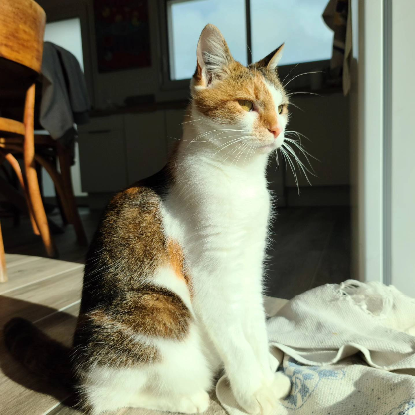 Niveau santé ? Indiana est une guerrière du quotidien : hyperthyroïdie, potassium, stress… Trois traitements à vie. Mais rien d’insurmontable pour qui aime les félins avec du vécu.