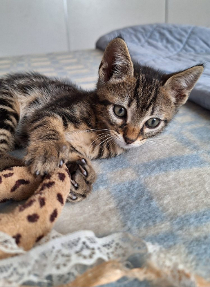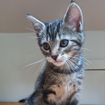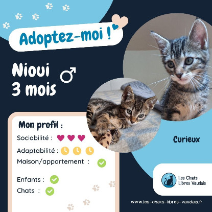 Nioui est un petit chaton de 3 mois, téméraire et bien dans ses pattounes ! Le petit leader du groupe, qui n’a peur de rien. Nioui chasse les mouches avec dextérité, il est intelligent et très rusé. Le petit futé du groupe, qui adore jouer et faire rire la galerie. Nioui est très attachant, et saura rendre sa famille adoptive très heureuse.