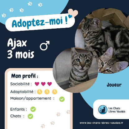 Pour Ajax nous cherchons une famille en maison ou appartement. Ajax pourra très bien vivre en appartement, avec ou sans balcon, avec ou sans extérieur. Ajax est compatible avec ses congénères chats. Et il pourra très bien vivre avec des enfants. Enfin, Ajax n’est pas encore autonome en journée, il aura donc besoin de beaucoup de présence et d’attention pour être heureux !