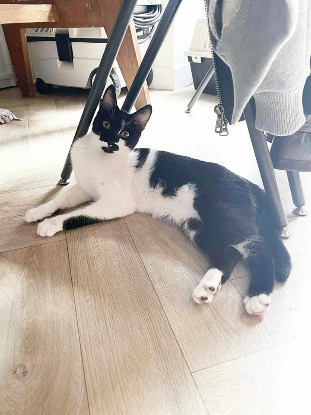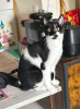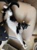 Adorable minette noire et blanche, ses tâches et ses coussinets bicolores vous feront craquer.
