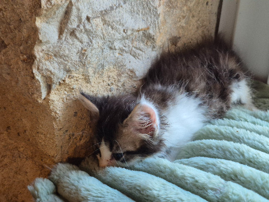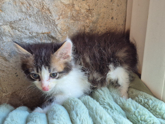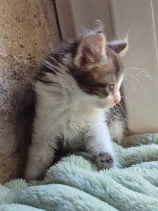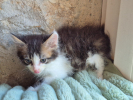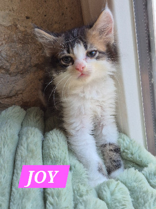 * ?Joy, femelle tigrée et blanche à poils mi-longs de tout juste 2 mois