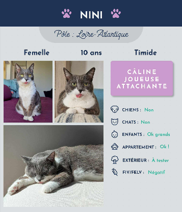 Je m'appelle Nini, je suis une petite mamie très câline. Je n'ai malheureusement plus mes dents mais ça ne m'empêche pas de manger des croquettes. J'ai juste ma langue qui sort un peu, ça me fait une bouille marrante