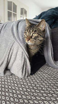 Bien sûr, c'est à force de patience et de compréhension qu'elle s'est détendue ! Elle en aura donc aussi besoin quand elle arrivera dans sa nouvelle maison pour révéler sa vraie nature : un vrai pot-de-colle. Ne vous méprenez pas, elle sait rester seule mais elle a toujours envie de jouer, de câlins et d’une présence réconfortante. Pas forcément besoin d'un copain félin, sauf s’il est FIV et sait respecter ses limites. Attention aux lapins en revanche, il semble qu’elle aurait envie de les croquer…