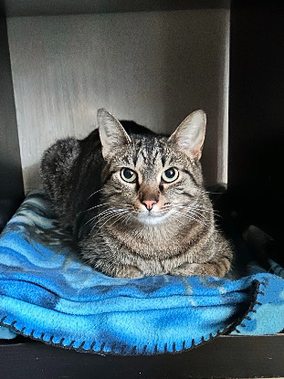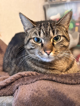 C'est un jeune chat curieux, aventurier et affectueux. Il se met sur ses 2 pattes arrières pour attirer l'attention et espérer recevoir des caresses. Il aime jouer et l'interaction avec les humains.