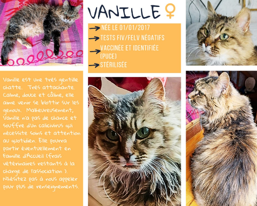 Vanille est une très gentille minette. Très attachante, calme, douce et câline. Elle aime venir se blottir sur les genoux. Malheureusement, Vanille, n'a pas de chance, elle est porteuse de calicivirus et nécessite des soins et une attention au quotidien.