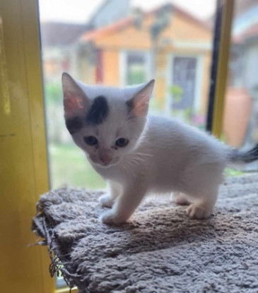 Chaton femelle, type Européen, coloris blanc et gris. Née le 18 avril 2025