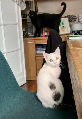 La présence des autres chats m'aide beaucoup, j'aime beaucoup les câlins et jeux avec eux, et je les observe avec curiosité se faire câliner par les humains.