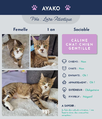 Bonjour, moi c'est Ayako. Je suis une belle et jeune chatte de tout juste 1 an.