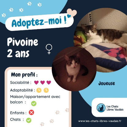Pivoine est une très gentille minette adulte, encore un peu chaton dans sa tête ! Pivoine est vive, joueuse et très rusée. Elle adore attraper des petites balles, sinon des plumes qui volent. On pressent qu’elle sera une super chasseuse de mouche ! Pivoine est aussi discrète, plutôt timide avec les humains qu’elle ne connait pas. Elle donne toute son intention à un ou deux humains, et leur promet une relation exclusive pleine d’amour. Pivoine aime autant les caresses que les bisous, c’est une belle minette avec beaucoup de qualités.