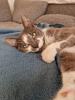 Dans la journée, j'aime bien siester dans des endroits exigus (sous les canapés par exemple) mais je n’hésiterai pas à sortir pour embêter mes copains chats, ou me frotter aux jambes des humains pour me faire caresser (parce que les caresses c'est trop bien!). Par contre, Je ne suis toujours pas à l’aise avec les mouvements brusques ou les gros bruits, et j'irai vite me cacher.