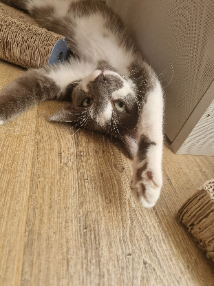 « Bonjour à tous, je suis un jeune chat, et je suis à l'adoption depuis plusieurs jours. Je viens d'une maison en surpopulation féline, et j'ai peu côtoyé les humains dans mes premiers mois de vie. Mais maintenant, ils commencent à me faire moins peur, et j'ai découvert qu'ils donnent à manger, et qu'ils font aussi des caresses si on leur demande (mmmm les caresses c'est trop bien!).