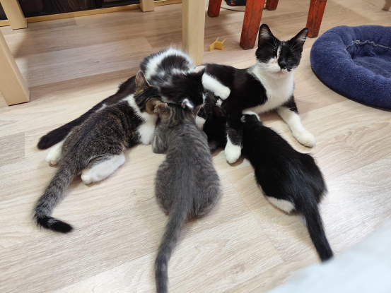 Désormais à l'abri, nourrie, soignée et stérilisée, elle profite pleinement des conforts de la vie en intérieur. Altesse est une minette douce, tendre qui s'occupe avec beaucoup de patience de ses petits.