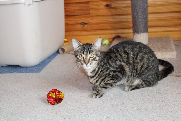 Joueur, calme et doux. Il est assez réservé et timide mais aime les caresses quand il est bien habitué aux gens et il adore la pâtée. C'est son petit rituel et il ne tardera pas à vous le demander si jamais vous tarder à lui donner.