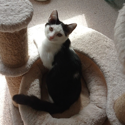 Azure a 3 mois, c’est une très belle chatoune noire et blanche. Azure est certainement la plus douce de la fratrie. Elle choisit avec soins les coins les plus douillets pour faire ses siestes, et elle aime les moments de complicité avec son humaine. Evidemment, comme tout bon chaton qui se respecte Azure est aussi très joueuse et curieuse. Azure est une chouette chatoune à découvrir, et elle offrera à sa famille adoptive beaucoup d’amour.