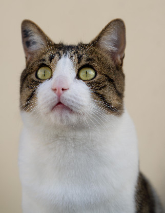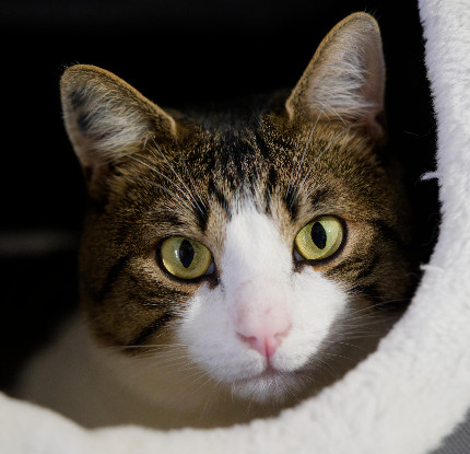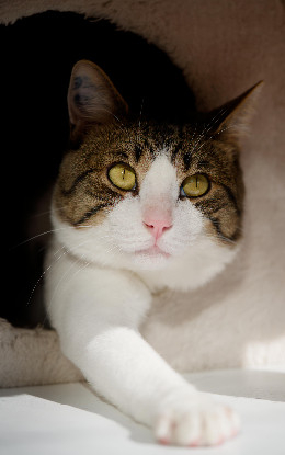 C’est un chat curieux et gourmand, toujours partant pour une sieste sur les genoux ou pour observer le monde depuis son arbre à chat.