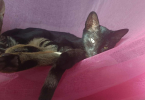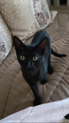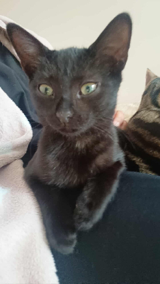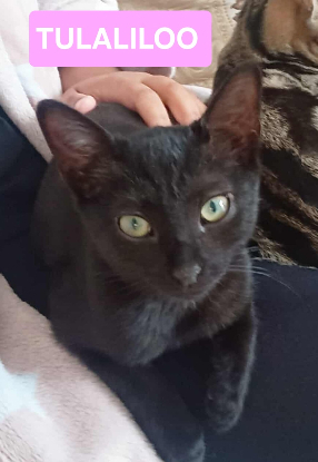 Petite chatonne au beau pelage noir et au yeux verts. TULALILOO est arrivée timide, mais à vite pris ces repères et s'est révélée être une grande joueuse et sociable avec l'humain grand comme petit. Elle adore les balles et les ficelles, et jouer avec les autres chatons. Elle aime les gratouilles et caresses, et quand vient l'heure de la sieste elle pourra se mettre dans un coin douillet, prêt de vous ou sur vos genoux pour dormir. Elle est calme la nuit.