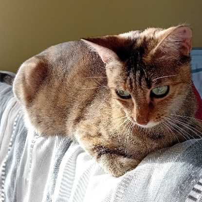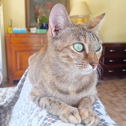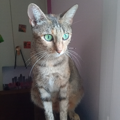 Mon pelage, très original est teinté de roux, de jaune et de bien d'autres couleurs et mon splendide regard vert est magnétique. Vous tomberez sous le charme c'est sûr.