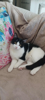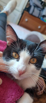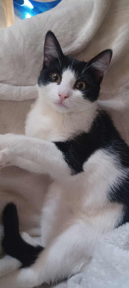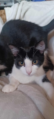 Chaton femelle, type Européen, coloris noir et blanc. Née le 16 mai 2025