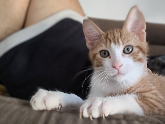 Ce spécimen est d’une rare tendresse, un véritable concentré de câlins sur pattes. En effet, il se distingue par sa sociabilité extrême et son goût très prononcé pour les contacts humains. Il adore se faufiler entre les coussins, se glisser sur vos genoux, dormir sur les chaises, sur les humains ou contre sa sœur — à croire qu’aucune sieste ne mérite d’être faite seul.