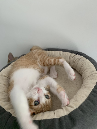 Il a aussi été observé en train de jouer, notamment avec la canne à pêche, qu’il attaque avec enthousiasme. Il accourt lorsqu’il sent les caresses arriver… ou lorsqu’il a faim. Là, c’est simple il vous colle comme une chaussette mouillée jusqu’à obtention du précieux repas.